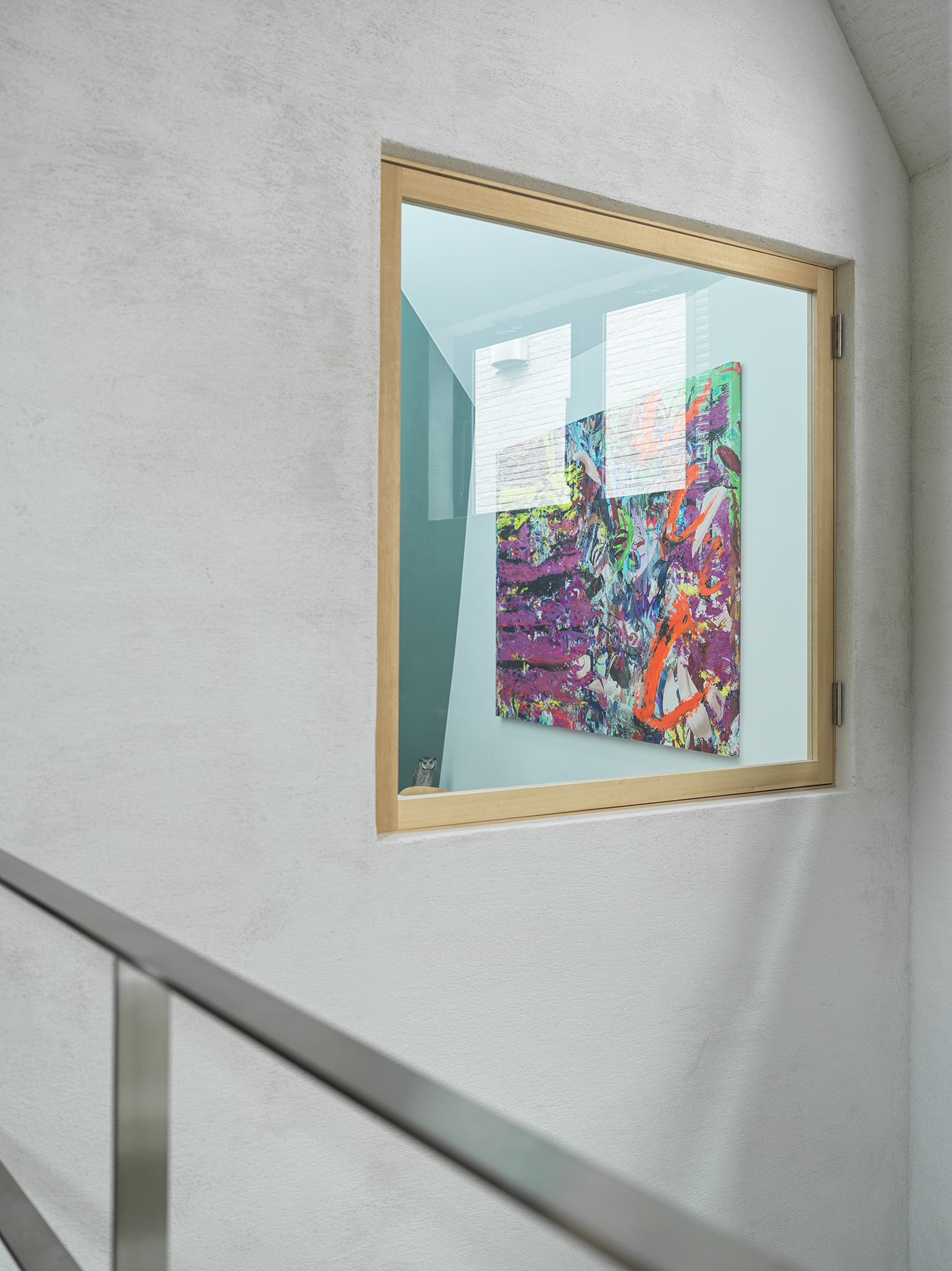 高低・明暗のコントラストの利いたヴォイドは、現代作家の仕事の仕方に対応した”溜まり”をつくっている。現代作家のライフスタイルも、コロナ禍を経てオンライン制作が主となった。従来の作家のアトリエのように、制作アシスタントが一堂に会する姿はもう見られない。代わりに、自邸が打合せの場となり、メディア露出をする際の撮影スタジオの役割を果たすようになった。つまり、現代における作家の仕事は、『1: 創作(閉じる)』『2: 打合せ(部分的に開く)』『3: 取材の受入れ(開く)』に分けられ、それぞれにあったプライベート / パブリックの濃淡が求められる。高低・明暗のコントラストを与えたヴォイドは、コンパクトな住まいの中で、繊細な場所の使い分けを可能にする”溜まり”を住まい手に提供することができる。