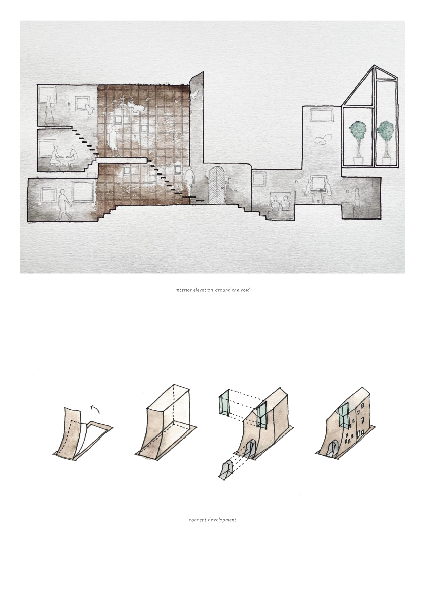 「日常から数cm浮いているような建築」をつくりたい、と思った。あくまで具体的な日常と接続しつつも、どこかフィクショナルな物語性が介在する、そんな住まいの在り方を目指した。着想のきっかけとなったのは、作家に所縁の深い大地が大きくめくれ上がり、建物が生まれ、内部ではフクロウが飛び回る、映画のワンシーンのような映像的なイメージだった。フィクショナルな映像的イメージを大切にしつつ、現代における作家のライフスタイルに対して具体的に住空間を落とし込んでいく、そのような設計方針とした。