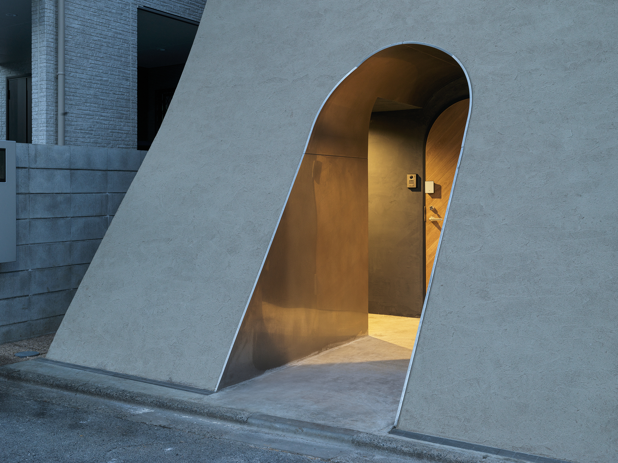 まずはじめに、作家に所縁の深い敷地を選定。前面道路に面する西側壁面は、大地がめくれ上がるイメージそのままに、無窓の曲面耐震壁として立ち上げた。曲面耐震壁をくり抜くかたちで、トンネル状のアプローチを計画し、日常から非日常に足を踏み入れる意図を持たせた特徴的なアプローチとした。全体の構成は、奥に細長い敷地形状を最大限に活かす目的で、東側の敷地奥手を三層・西側の前面道路側を二層のスキップフロアとし、スキップする床レベルを一部入れ替え、かつ極端な高低を与えた。敷地北側には、間口1.2m・最大高さ5.5mの光庭を、ヴォリュームをくり抜くかたちで挿入、その他の開口部は可能な限り減らし、家中をアメーバ状に拡がるヴォイドに対して明暗のコントラストを与えた。そこに階段を一直線に通すことで高低・明暗のコントラストの利いたヴォイドの中を、一直線に突っ切っていく、ストーリーのある立体構成とした。階段に沿って立ち上がるのは、高さ6.5mのツーバイエイト材による本棚である。建物構造の一部であると同時に、現代アートコレクターとしての顔も持つ施主による垂直のアートギャラリーとして計画した。