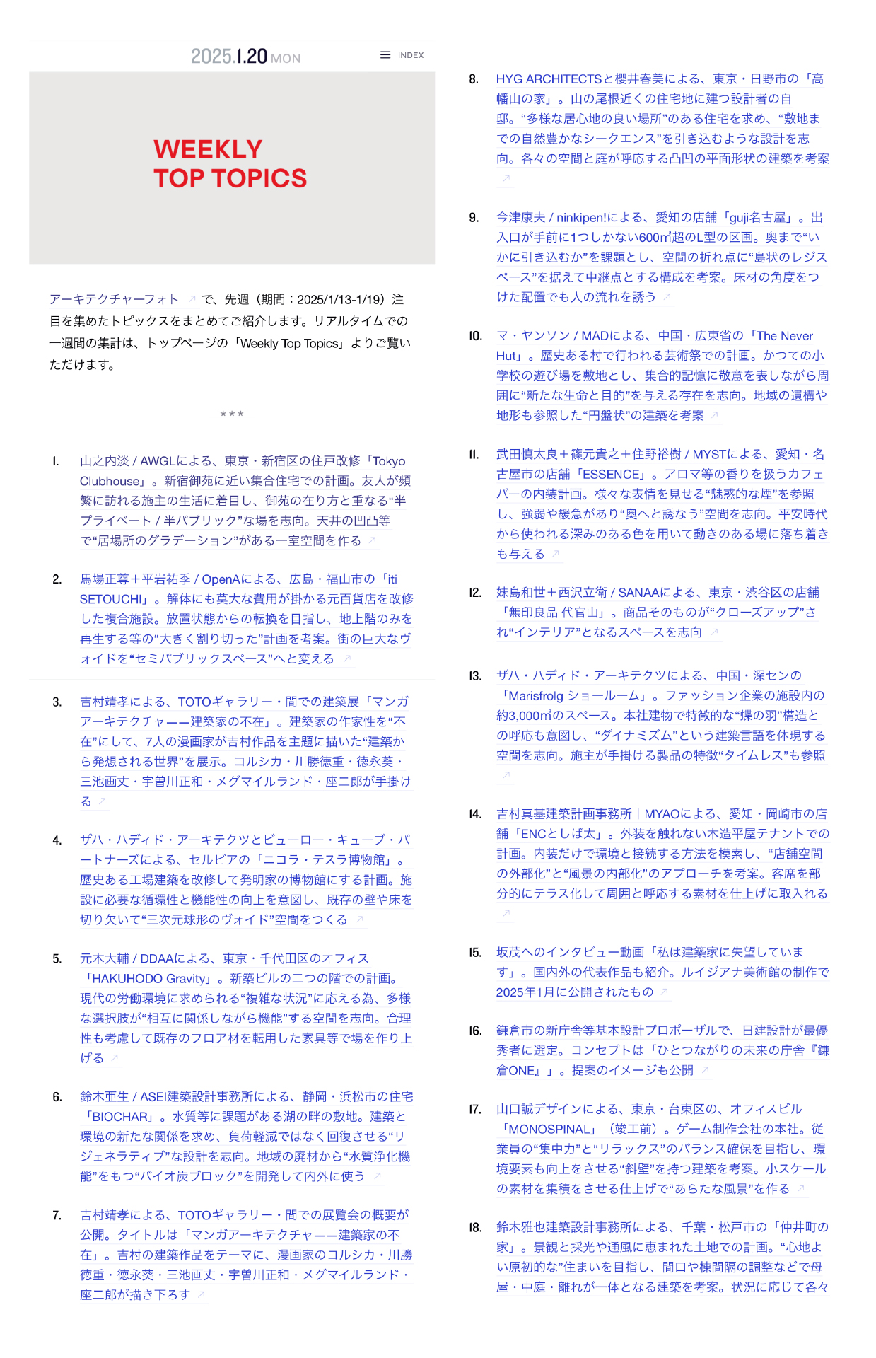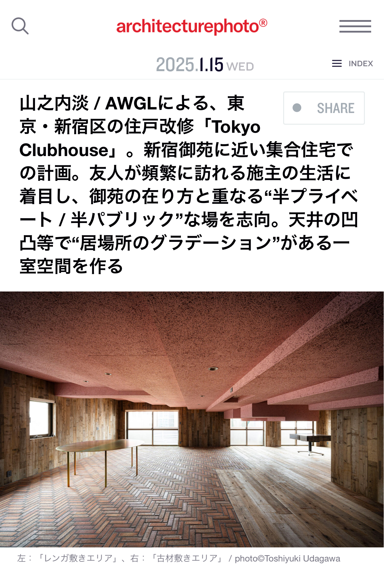 建築家・山之内淡の建築作品【Tokyo Clubhouse】が、日本最大級の建築メディアArchitecture Photo誌に掲載されました。同時に、1週間で最も閲覧数が多く注目を集めた作品として、WEEKLY TOP TOPICSにて1位を獲得しました。