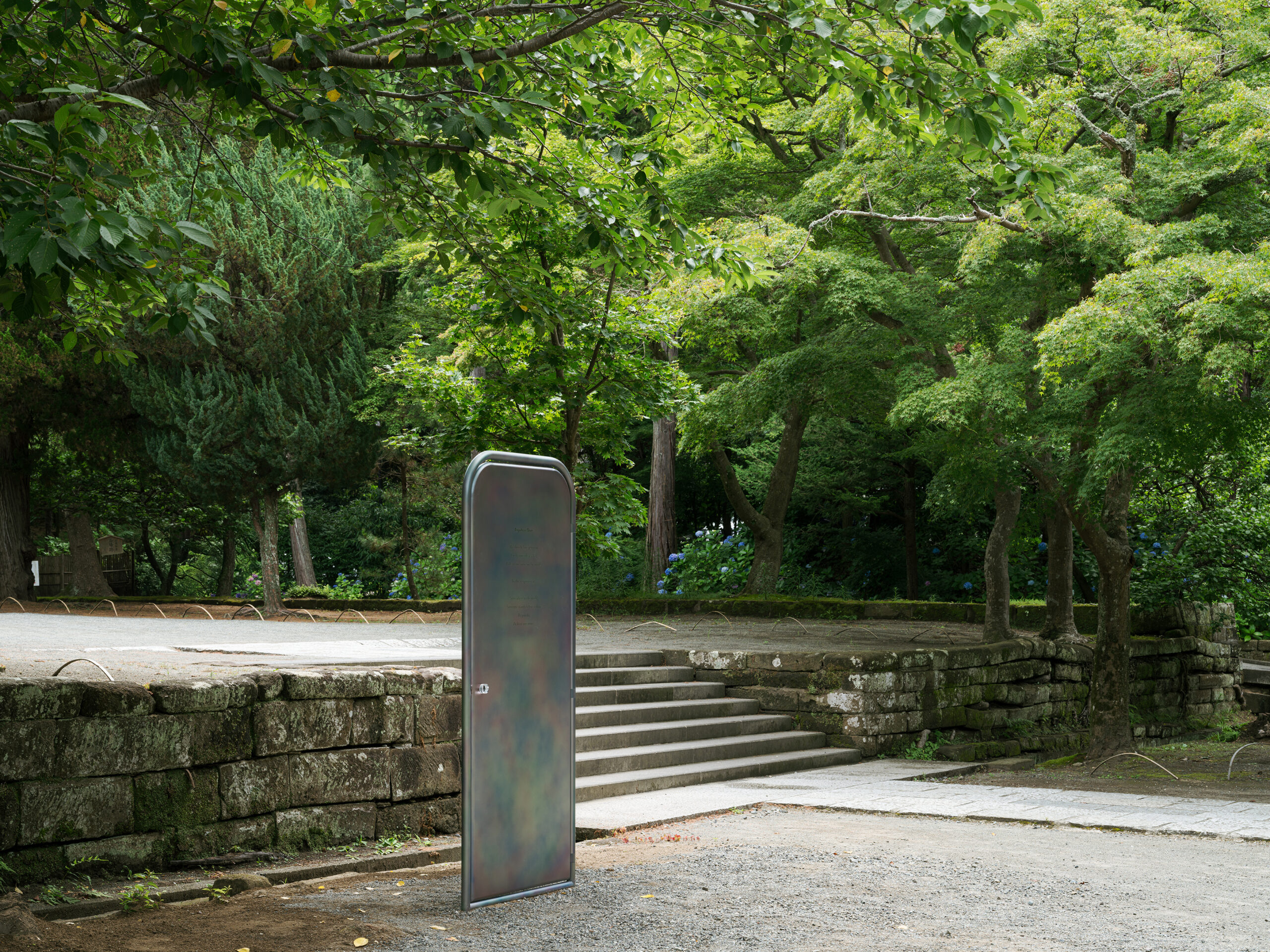 *fig.03 《Anywhere Door》北鎌倉・臨済宗大本山 円覚寺での写真。文化庁から許可を得て、鎌倉市文化財課立ち会いのもと、少なくとも江戸時代頃から一度も掘削されていない山門のある広場に枕木で仮設基礎をつくり設置された。