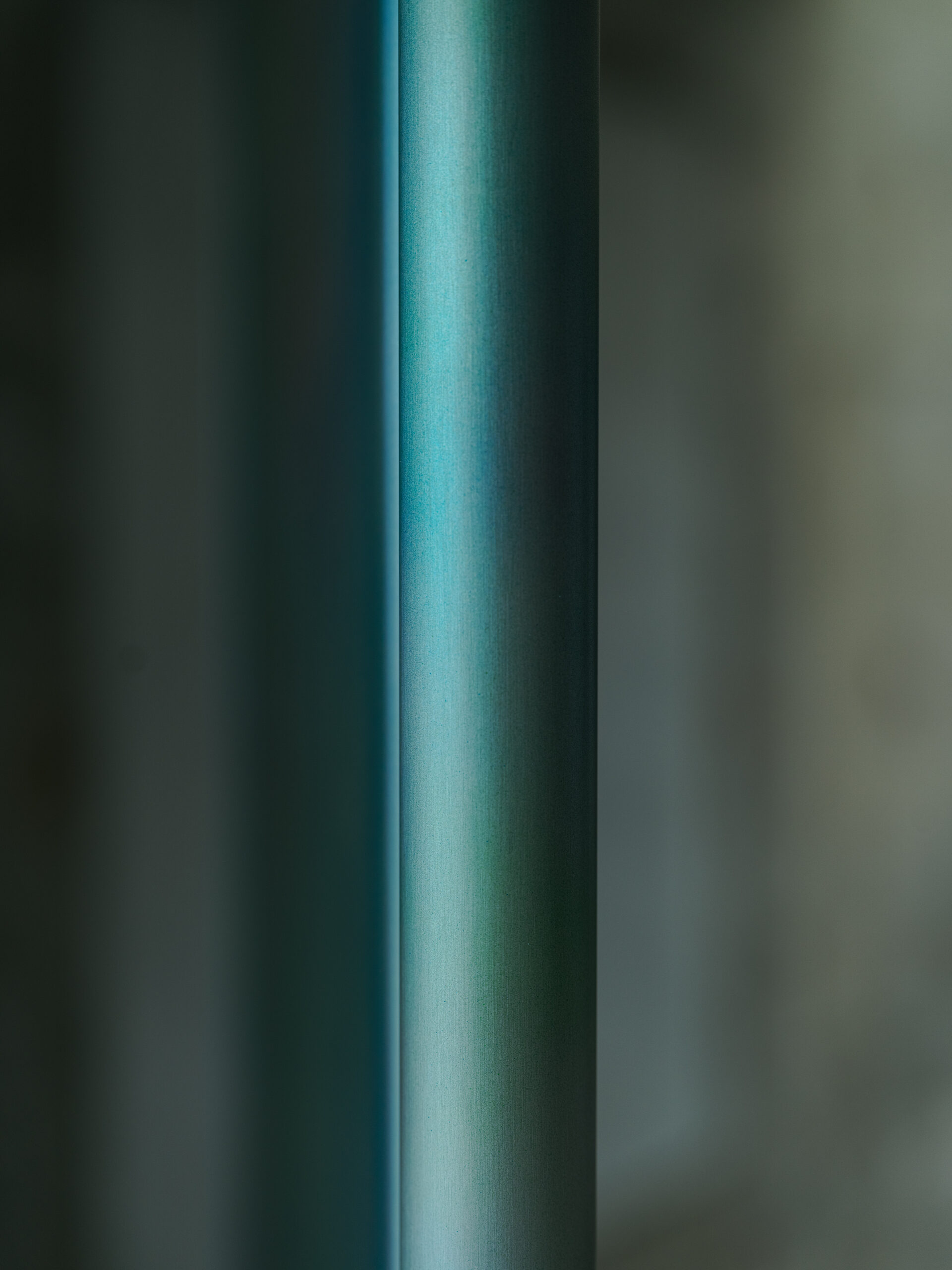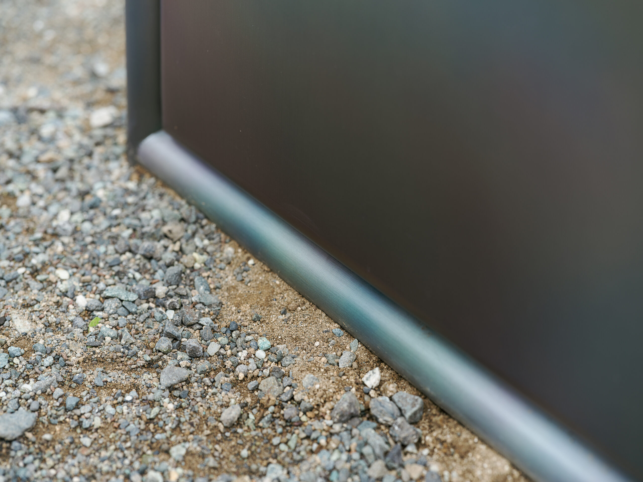 素材には、扉本体・扉枠ともにすべてステンレス鋼を採用しています。扉枠は直径38mm のステンレス丸パイプを外皮としてステンレス丸パイプの2 重構造とし、扉本体の端部はR加工として、扉と枠が一点で接する収まりとしています。扉が回転するヒンジ部分は切り込みを入れ外皮がそのまま回転する意匠とし、扉枠は平滑に収めています。また、ビスは1 本も使用せず、溶接のみで組み立てを行っています。仕上げはステンレスヘアラインを残しつつ、5 色使用した塗装を職人の手作業で施しています。