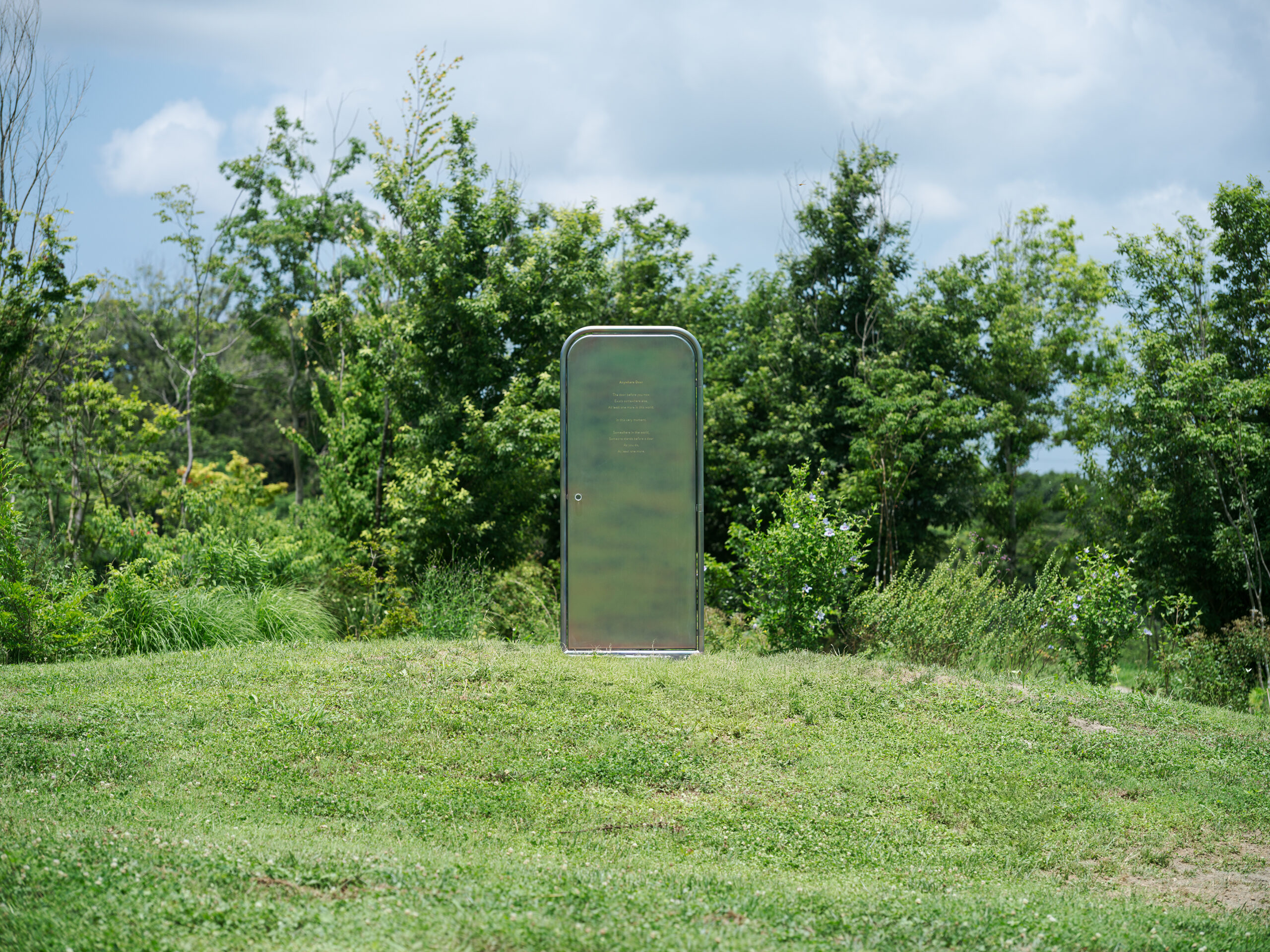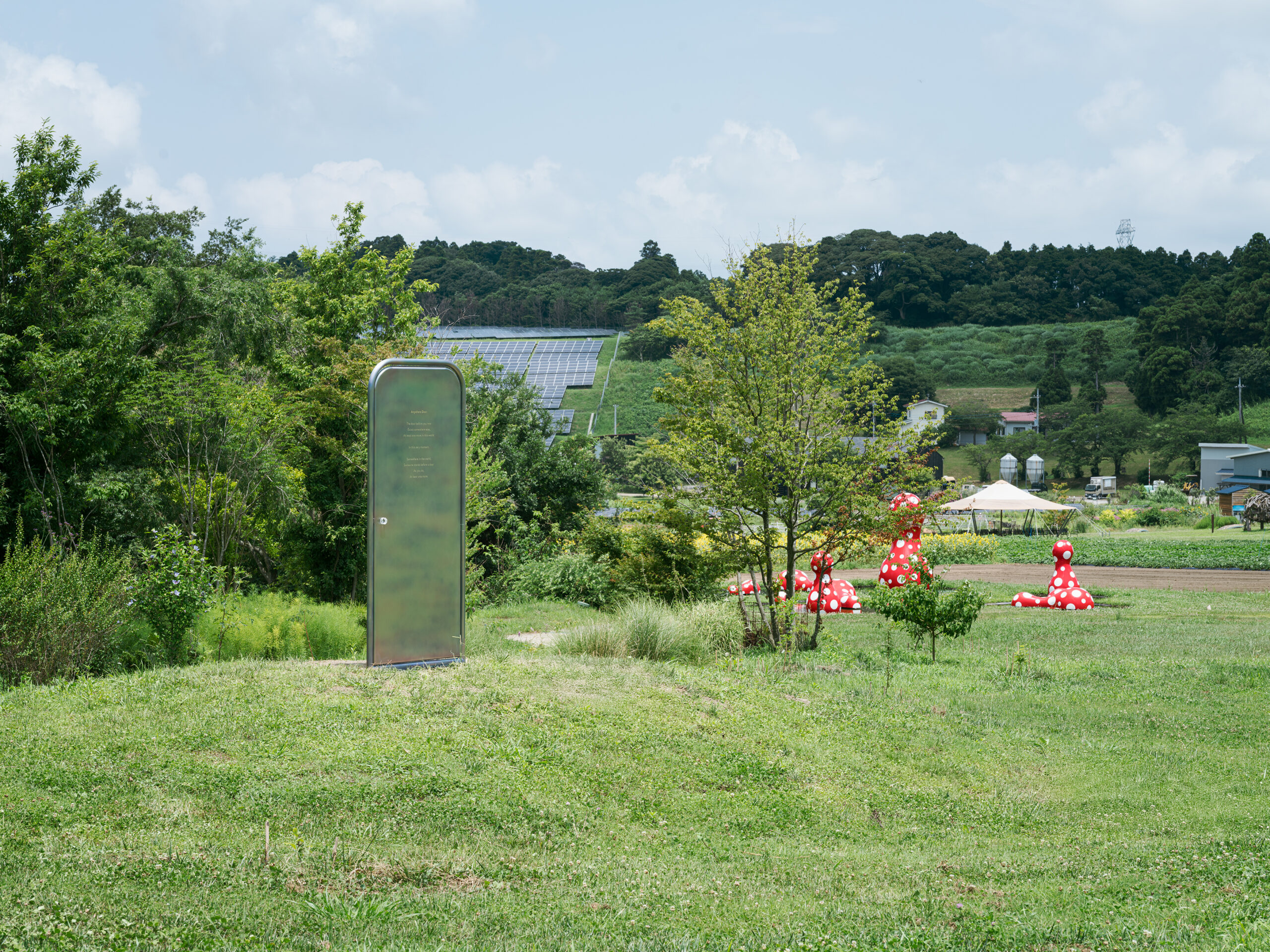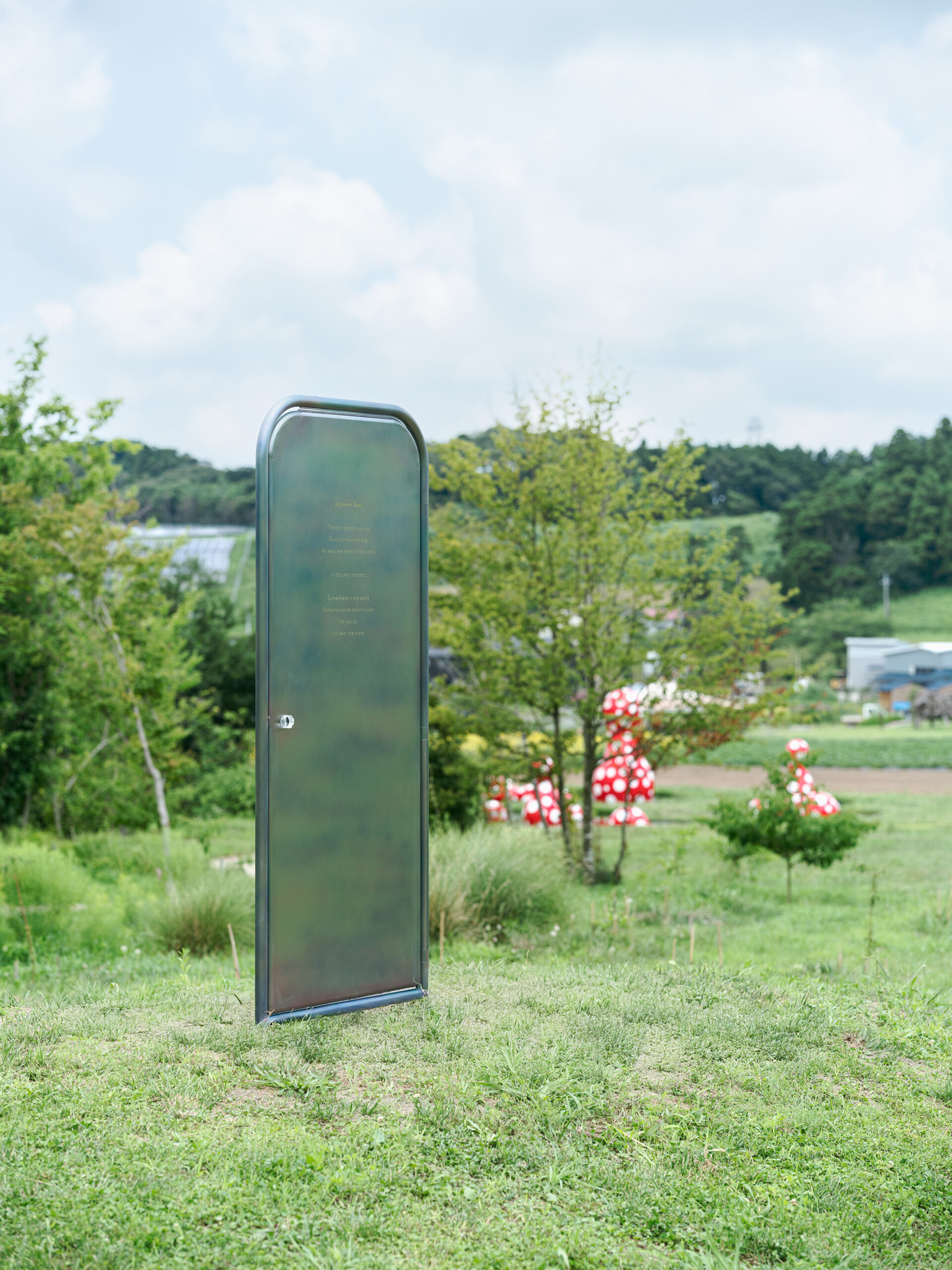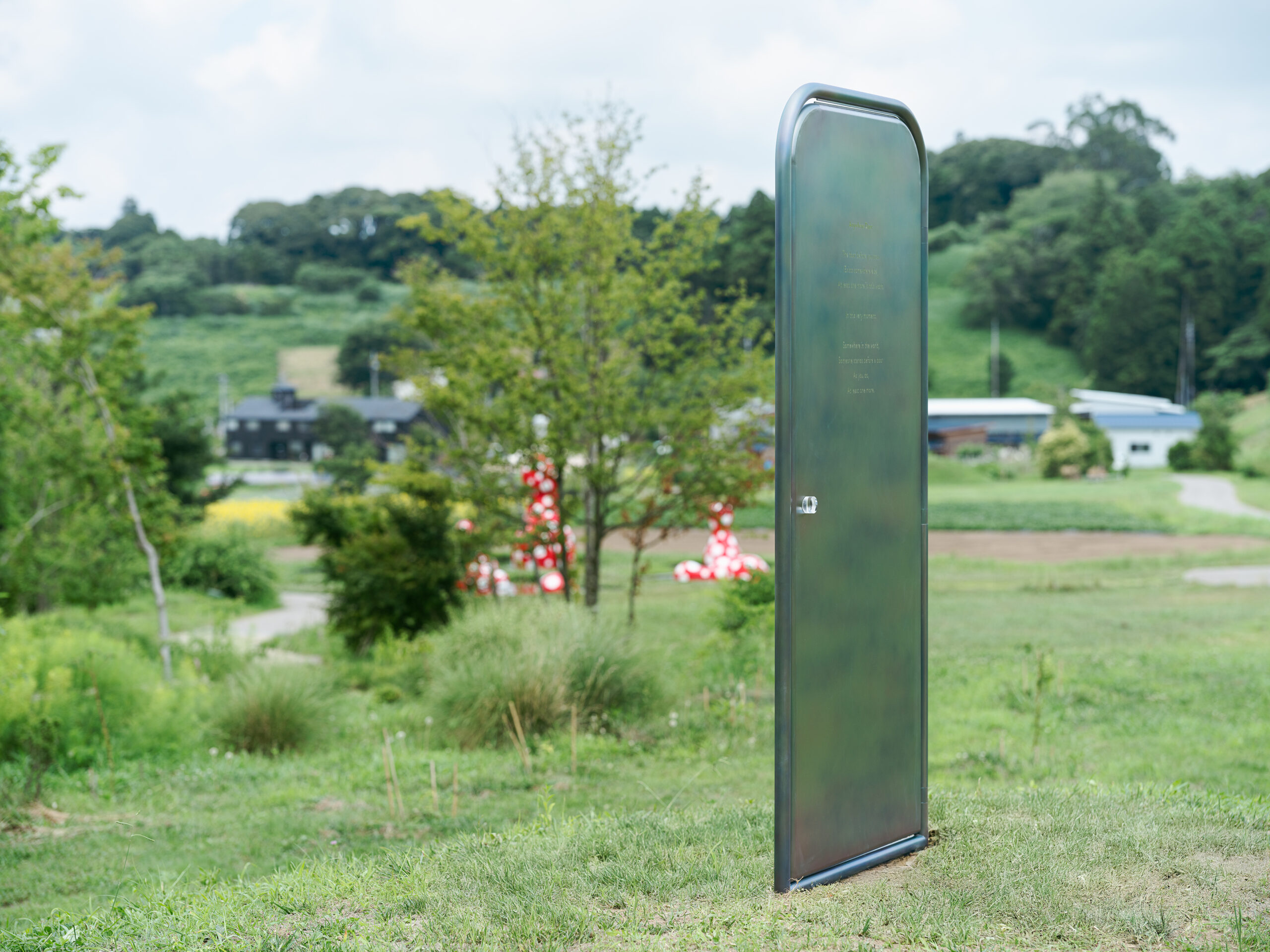 *fig.04 《Anywhere Door》木更津・KURKKU FIELDS での写真。常設作品として園内に展示されることになった。鉄筋コンクリート基礎をつくり設置された。作品への近づきやすさや園内での見え方も考慮された。背後には緑が生い茂る。奥に見える赤と白の彫刻作品は現代美術家の草間彌生氏によるもの。