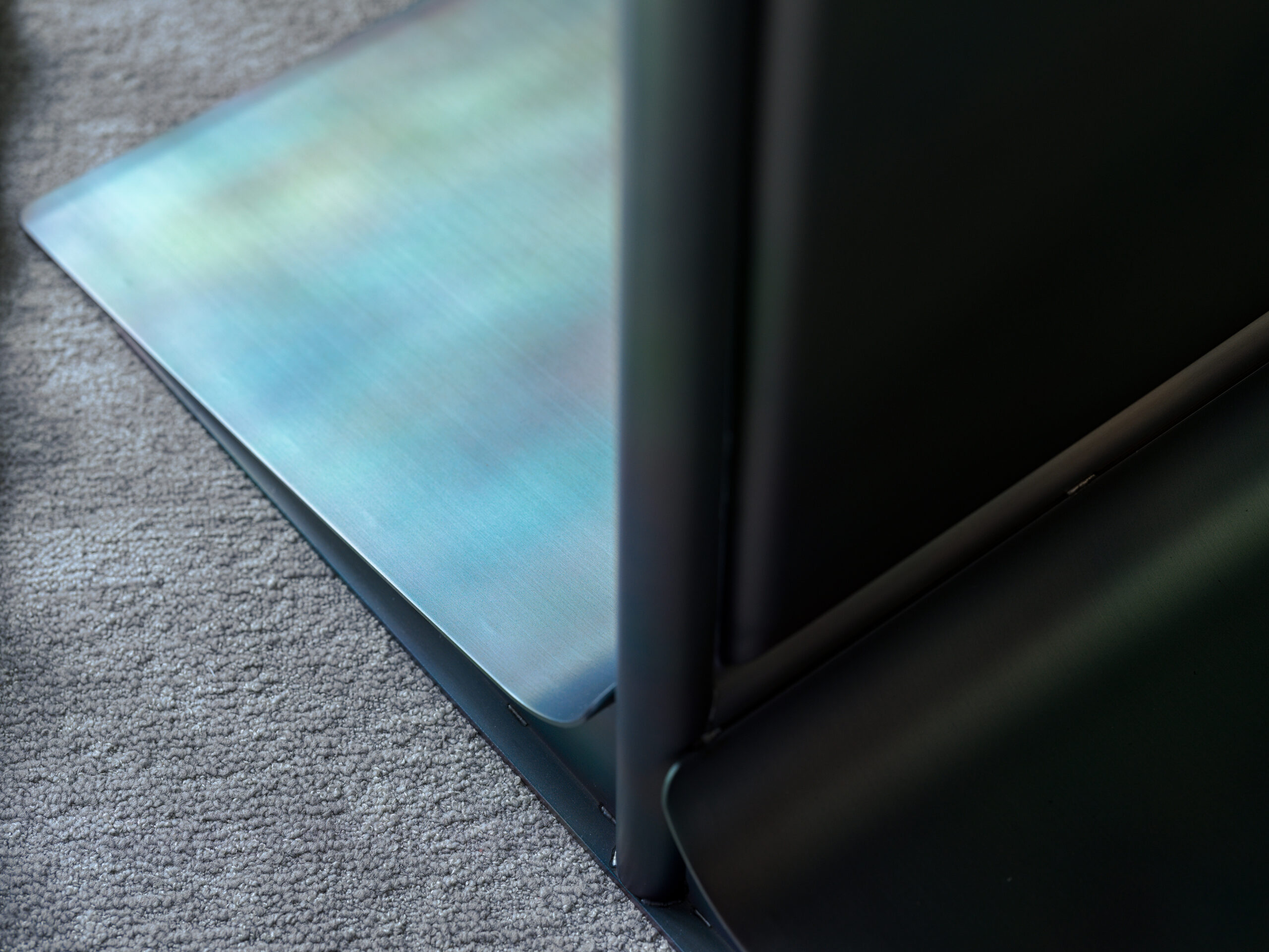 《Anywhere Door》4箇所のうち、唯一の屋内作品となることから、床の仕上面のカーペットと自然に作品がつな がるよう工夫して、曲面状に立ち上げる脚部を設計/ 制作しました。白井屋ホテルのヘリテージタワーは、屋内 空間ではあるものの、都市的な体感とスケールを持つ美しい街のような空間だと思います。そんな「街」の一部 になりつつ、この場所から出発したり辿り着いたりするような物語を感じられる設置場所を選定しました。